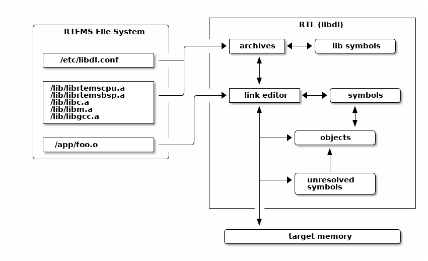 The RTEMS operating system contains a link editor that runs on the target. The link editor supports loading Extendable Linker Format (ELF) relocatable executable object files locating the code and data in the target’s address space as it is loaded. An executable object file’s external references to function identifiers and data object identifiers are resolved and any external symbols can be made available in the global symbol table. The executing performance of dynamically loaded code is similar to the same code statically linked into an executable. This is a core requirement of the RTEMS link editor.