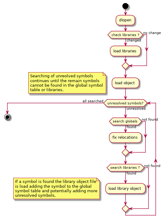 A call to dlopen() checks the global symbols table and any references to relocation symbols not found are unresolved and added to the unresolved symbol table. Once the executable object file is loaded the link editor attempts to resolve any unresolved symbols. The unresolved symbol resolver checks each unresolved symbol against the global symbol table and if not found the available library symbol tables are searched. If a symbol is found in a library the dependent executable object file is loaded. The process repeats until all unresolved symbols have been resolved and the remaining unresolved symbols are not in the global symbol table or any libraries. The loading of a library executable object file will resolve at least one symbol and it may add more unresolved symbols requiring further searching of the libraries.
