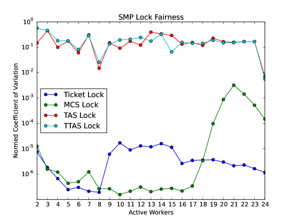 The test program SMPLOCK 1 can be used to gather performance and fairness data for several scenarios. The SMP lock performance and fairness measured on the QorIQ T4240 follows as an example. This chip contains three L2 caches. Each L2 cache is shared by eight processors.
