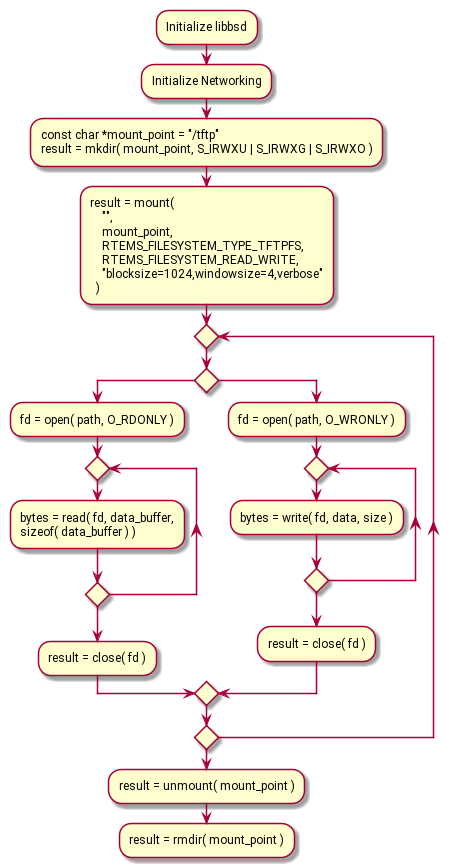 The RTEMS TFTP filesystem implements a TFTP client which can be used through the file system. With other words, one needs to mount the TFTP filesystem and can afterwards open a file for reading or writing below that mount point. The content of that file is then effectively read from or written to the remote server. The RTEMS implementation implements the following features: