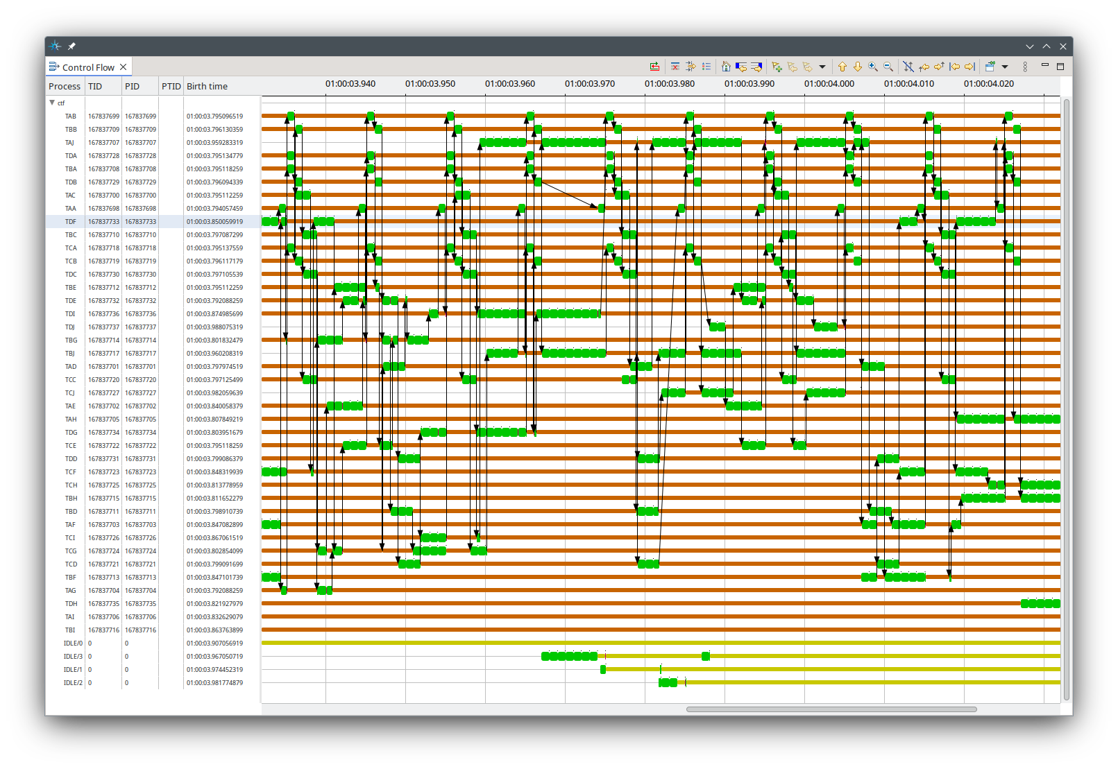 Fig. 12.6 The Control Flow view shows which threads execute when on which CPU. The arrows indicate thread switches.#