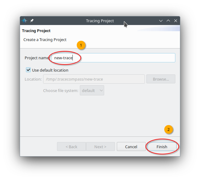 Fig. 12.2 In the Tracing Project dialog box, select a name for your tracing project. We select new-trace. Afterwards, continue with a click to Finish.#