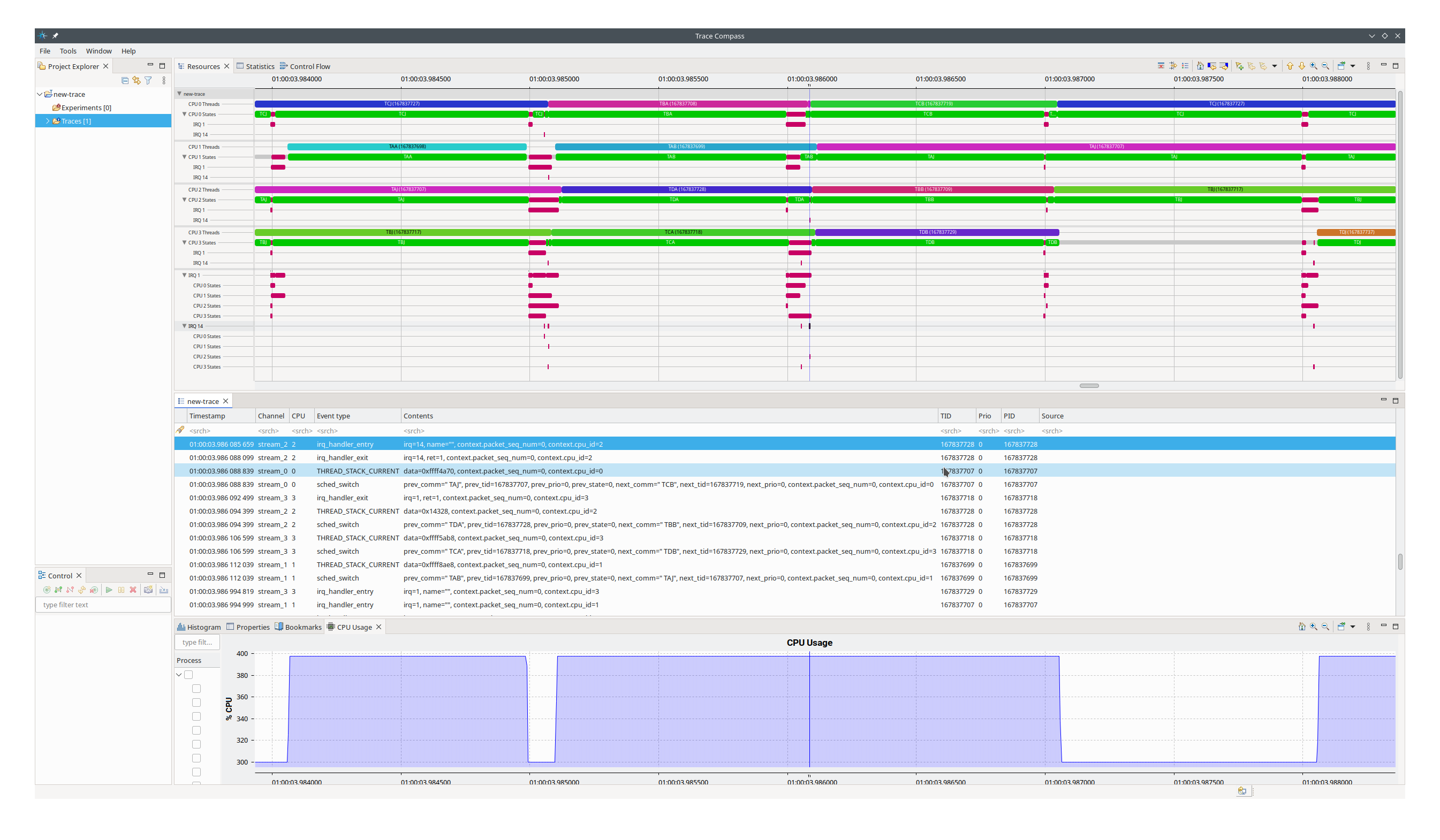 Fig. 12.5 Once a trace is opened, the main window shows you a couple of views, for example Resources, the trace log, and CPU Usage. The Resources view shows you the CPU utilization at a given time. A CPU may be idle, executing a thread, or executing an interrupt. The selected trace item in the trace log is shown as a vertical time bar in the Resources and CPU Usage view.#