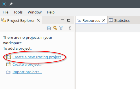 Fig. 12.1 After starting Trace Compass the first time, the Project Explorer tells you that there are no projects in your workspace. Select Create a new Tracing project. This will open the Tracing Project dialog box.#