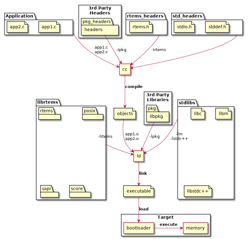 Applications are built from source into ELF object files, third-party packages can be built as libraries or they can be imported as source into an application code base. The application, third-party packages, RTEMS and standard libraries are linked to create the RTEMS executable. The executable is transferred to the target and a bootloader loads it from the non-volatile storage into RAM or the code is executed in place in the non-volatile storage. The target hardware defines what happens.
