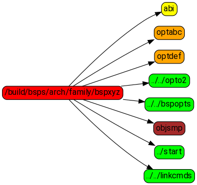 abiclangfor the clang-specific ABI flags item of a BSP family. Each BSP family may have at most one Build Option Item Type item which defines the clang-specific ABI flags for all base BSPs of the family. For an architecture named arch and a BSP family named family, the file path isspec/build/bsps/arch/family/abiclang.yml.- bsp*